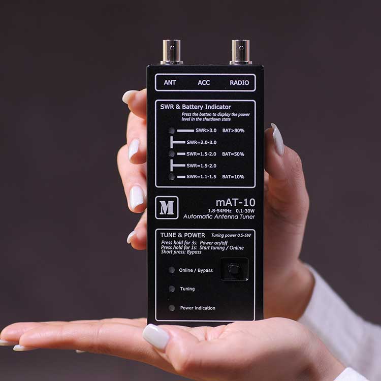 All'interno del mAT-10 sono installate due batterie al litio 10440, che alimentano l'accordatore. A causa dell'uso di relè di ritenzione magnetici avanzati, il consumo energetico di mAT-10 è molto ridotto, la batteria al litio può funzionare a lungo dopo essere stata completamente caricata. È molto adatto per uso esterno. I caricatori speciali sono forniti con i sintonizzatori. È necessario utilizzare il proprio caricatore per caricare il sintonizzatore. È pericoloso caricare con un caricabatterie errato.